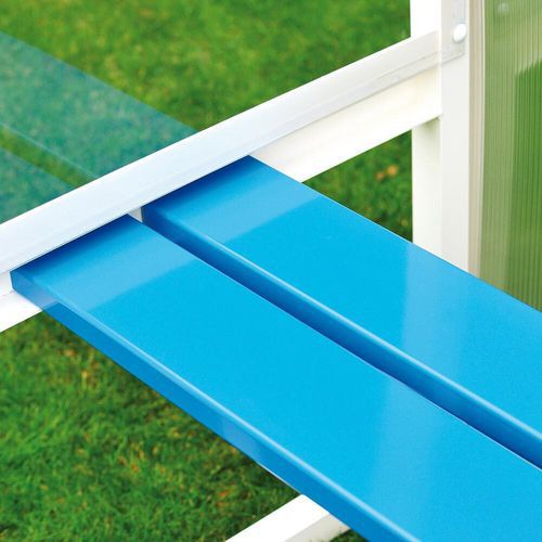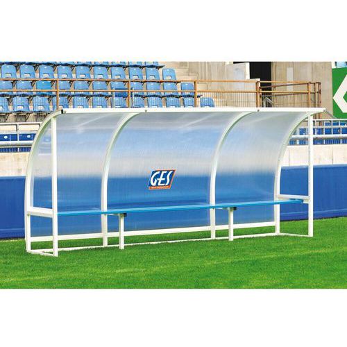 Abri de touche en alu GES, structure en aluminium soudé thermolaqué blanc, muni d'un banc en aluminium peint en bleue. Abri muni d'une casquette à l'avant pour plus de confort. Revêtement arrière en polycarbonate alvéolé de 6 mm et de coté en polycarbonate translucide de 2mm. Dimensions : Hauteur : 2 m, profondeur : 0.90 m.