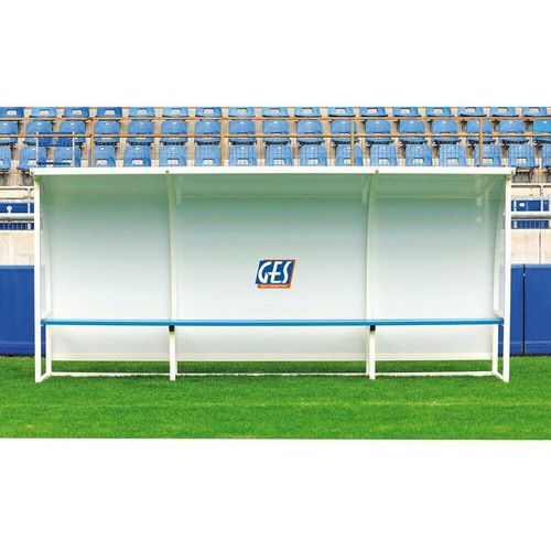 Abri de touche en GES, structure en aluminium soudé thermolaqué blanc, muni d'un banc en aluminium peint en bleu. Abri muni d'une casquette à l'avant pour plus de confort. Revêtement arrière en ALU/PVC/ALU plastifié en blanc et de côté en polycarbonate translucide. Dimensions : Hauteur : 1,60 m, profondeur : 0.90 m. Existe en 8 longueurs : 1 m, 1.5 m, 2 m, 3 m, 3.5 m, 4 m, 5 m et 6 m. Coloris de la structure : blanc.