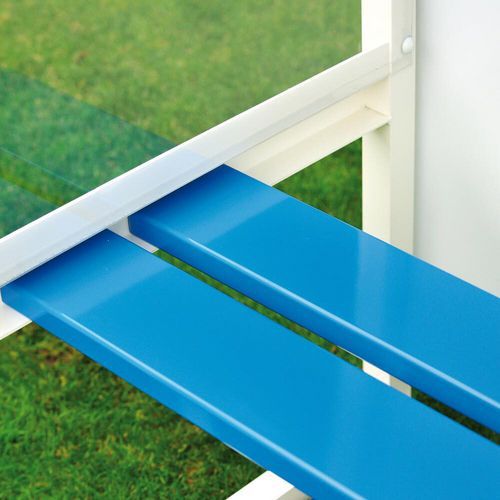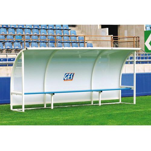 Abri de touche en GES, structure en aluminium soudé thermolaqué blanc, muni d'un banc en aluminium peint en bleu. Abri muni d'une casquette à l'avant pour plus de confort. Revêtement arrière en ALU/PVC/ALU plastifié en blanc et de côté en polycarbonate translucide. Dimensions : hauteur : 2 m, profondeur : 0.90 m. Existe en 8 longueurs : 1 m, 1.5 m, 2 m, 3 m, 3.5 m, 4 m, 5 m et 6 m. Coloris de la structure : blanc.