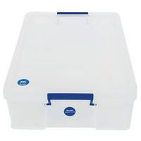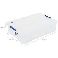 Bac de rangement solide et très stable. Pratique, le transport est facile grâce aux poignées. Reconnaissance rapide des objets à l'intérieur du bac grâce à a sa transparence. Fabriqué au RU Certifié NSF Charge maxi (kg) : 200 kg