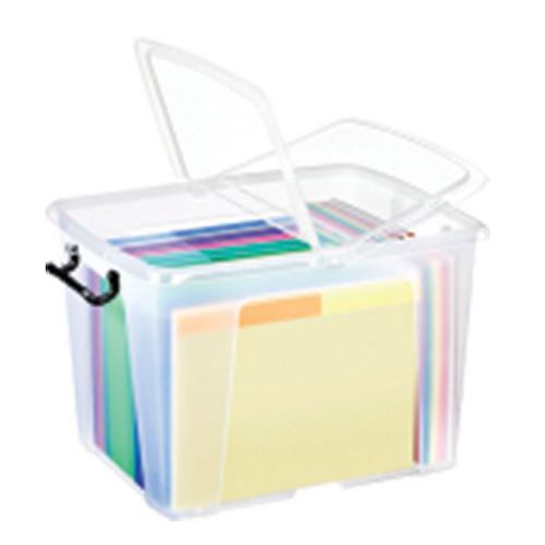 Bac plastique robuste aux parois pleines renforcées 4 faces. Forme conique garantissant gerbage et emboîtage parfaits. Accès facililité sur les côtés par couvercle à double rabat. Bac à fermeture efficace avec 2 solides poignées clipsables.