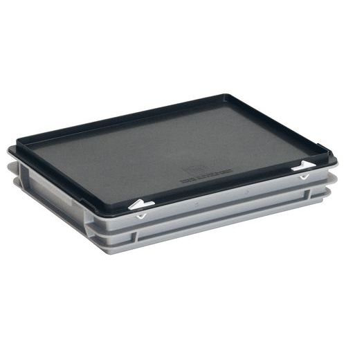 Bac gerbable Norme Europe avec couvercle. Equipé de couvercle à charnière avec renforts ainsi que 2 fermetures à ressorts. Deux porte-étiquettes sur 2 côtés (1 sur un grand côté à l'avant du bac et 1 sur un petit côté).