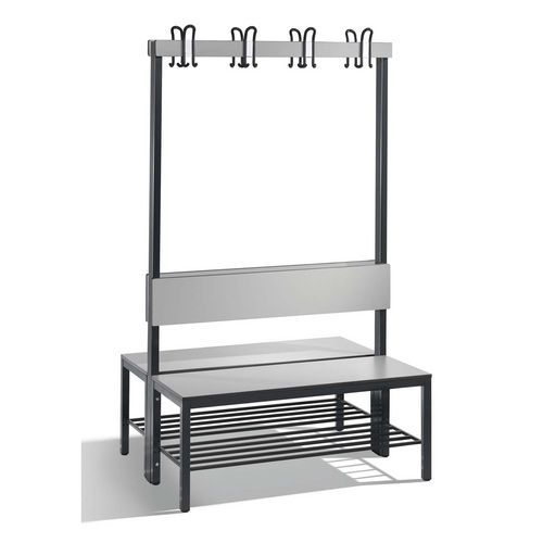 Banc de vestiaire double avec dossier dos à dos, grille de chaussures et patères, idéal pour vos vestiaires.
