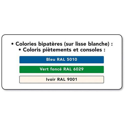 - Console en tube d'acier de section carrée 30 x 30 mm et rectangulaire 35 x 15 mm enrobé de résine 100 % polyester cuite au four.