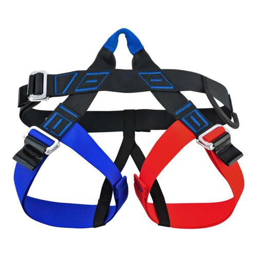 Harnais d'escalade entièrement réglable, cuisse droite bleue, cuisse gauche rouge pour des repères visuels facilitant la mise en place.