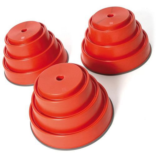 Composé de 2 sommets de 10 cm, de 3 sommets de 24 cm, de 5 planches. Les sommets sont en matière plastique avec un rebord en caoutchouc synthétique antidérapant. Empilable, pour le rangement, les planches sont en matière plastique avec renfort en acier.
