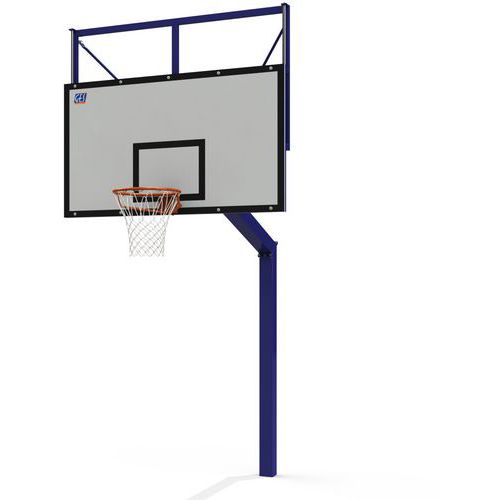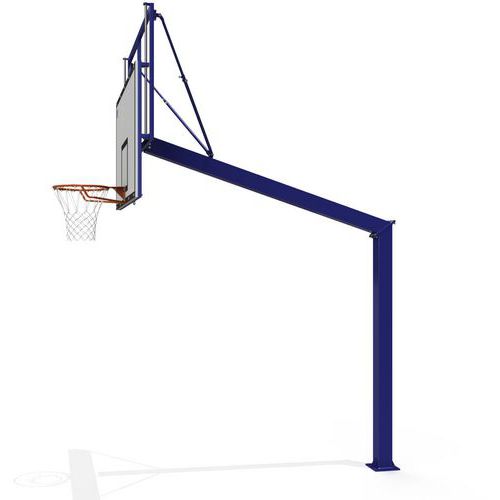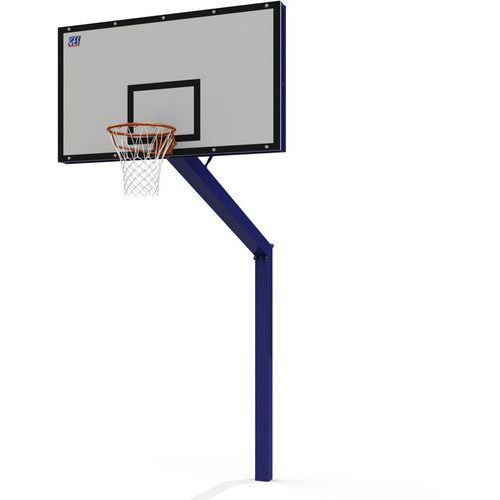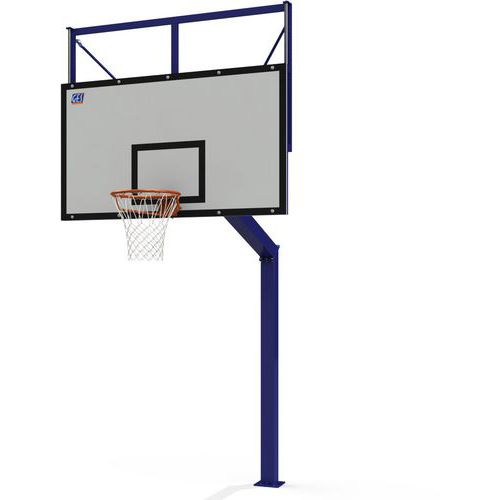 But de basket GES extérieur sur pied à sceller au sol ou sur platine pour une stabilité optimale Hauteur du panier de basketball réglable à 2,60m ou 3,05m Déport de 2,25 m Poteau en acier galvanisé à chaud peint en bleu, section carrée 140x140 mm garantissant robustesse et longévité Panier de classe B Panneau rectangulaire en fibre de verre avec tracé officiel Cercle fixe Filet en polyester de couleur blanche Conforme norme NF EN 1270 et au code du sport Garantie 2 ans