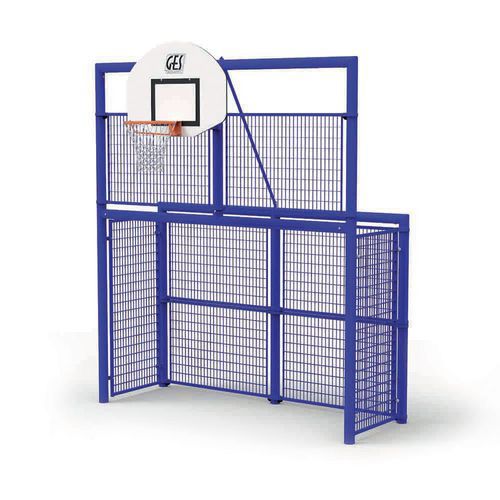 Un but en tube acier galvanisé thermolaqué Ø 102 mm. Dimensions intérieures du but : 3 x 2 m. Coloris : jaune. But certifié conforme a la norme 15312. Un fond de but et deux côtés des buts en panneaux «type caillebotis» en acier galvanisé thermolaqué, mailles 44 mm x 100 mm. Coloris : jaune. Un panneau de basket forme demi-lune, dimensions 120 x 90 cm en PEHD, monté sur une structure très robuste, déport du panneau de basket par rapport au but : 60 cm, livré avec cercle + filet. Deux panneaux «type caillebotis» en acier galvanisé thermolaqué, mailles 44 mm x 100 mm sont fixés à l'arrière du panneau de basket. Montage sur bagues aluminium avec système de réduction de bruit. Scellement sur platine. But certifié conforme au code du sport. Une notice de montage détaillée est fournie avec le matériel.