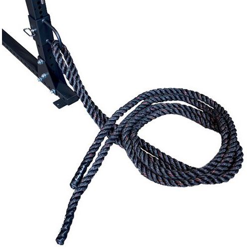 des squats, des fentes, des tractions, des dips, des exercices avec tirage de barre haut et bas, anneau pour fixation d'une corde ondulatoire et d'une base pour fixer une barre olympique afin de faire des levers de sol avec une partie de la barre fixée au sol.