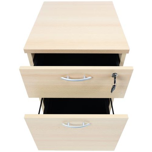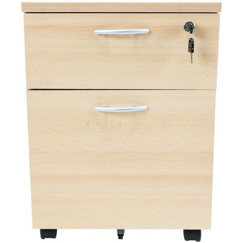 Caisson avec tiroirs en panneaux de particules surfacés mélaminés. Mobilier équipé de roulettes anti-basculement. Verrouillage avec serrure à cylindre (1 seul tiroir). Un programme efficace et robuste d’une installation aisée