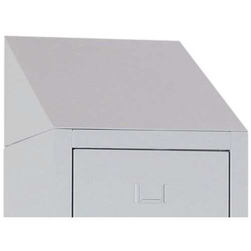 Coiffe inclinée pour vestiaire 1 à 4 colonnes. Évite l'encombrement et la chute d'objets. Positionnement au-dessus du vestiaire. Coiffe monobloc résistante en acier. Entretien aisé grâce à l'inclinaison limitant le dépôt de poussière.