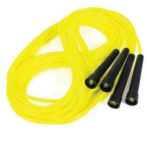 - Corde rapide en matériau synthétique, dans des coloris fluo, munie de poignées en plastique noir.