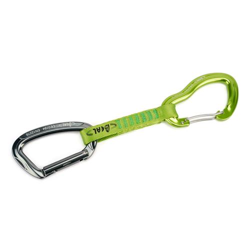 Dégaine complète formée d'un mousqueton doigt fil vert et d'un mousqueton doigt plein droit de couleur grise avec système Keylock, tous 2 reliés par une sangle express de 11 cm.