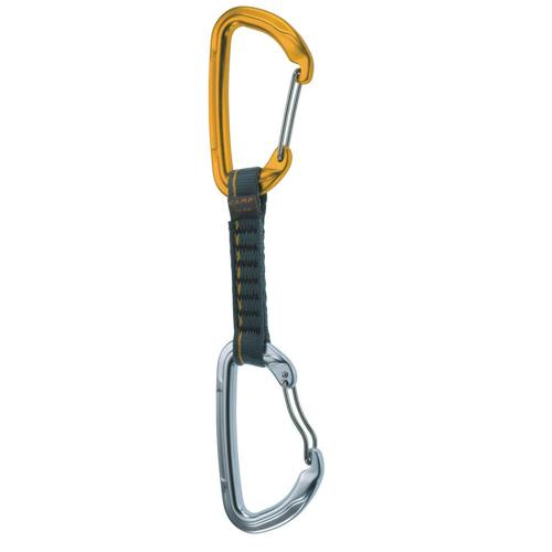 Dégaine complète formée d'un mousqueton doigt droit fil acier et d'un mousqueton doigt fil acier plié qui facilite l'entrée de la corde et empêche le mousqueton de se placer transversalement.