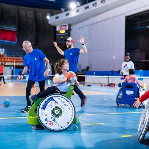 Fauteuil enfant KidsMoovin' permet la pratique sportive d’un sport collectif comme le handfauteuil, le basket fauteuil, les sports de raquettes, et bien plus encore.