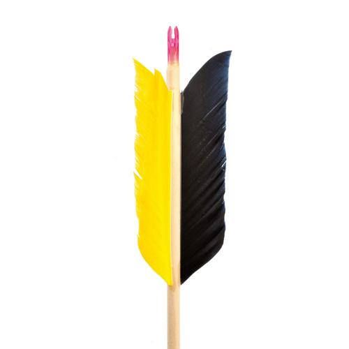 Flèche en bois montée avec 4 plumes naturelles FLU-FLU et encoche. Livré sans pointes. Idéal pour les cibles animaux en 3D.