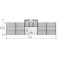 Un fronton : poteaux supports Ø 102 mm et panneaux «type caillebotis», mailles 42 x 98 mm. L'ensemble est en acier galvanisé thermolaqué. Largeur totale du fronton : 12.2 m. Un but en tube acier galvanisé thermolaqué Ø 102 mm pour les parties avant et arrière, dimensions intérieures du but : 3 m x 2 m, Un fond de but et deux côtés des buts en panneaux «type caillebotis» en acier galvanisé thermolaqué, mailles 42 x 98 mm. Un panneau de basket forme demi-lune, dimensions 120 cm x 90 cm en PEHD renforcé, monté sur une structure très robuste, déport du panneau de basket par rapport au but : 60 cm, cercle très renforcé «anti-vandalisme» sans filet. Montage en scellement direct. Modèle sur platine, nous consulter. But certifié conforme au code du sport. Une notice de montage détaillée (comprenant également les cotes nécessaires à la mise en oeuvre des massifs en béton) est fournie avec le matériel. Finition : Galvanisée