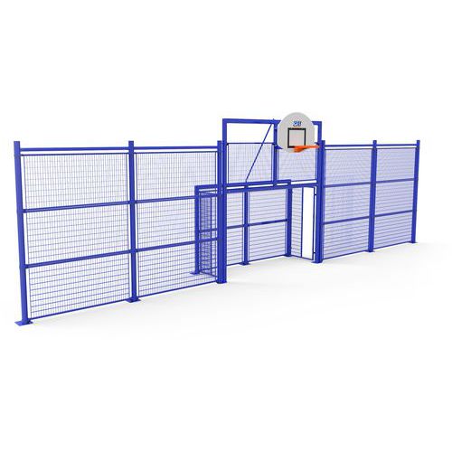 Un fronton : poteaux supports Ø 102 mm et panneaux «type caillebotis», mailles 42 x 98 mm. L'ensemble est en acier galvanisé thermolaqué. Largeur totale du fronton : 12.2 m. Un but en tube acier galvanisé thermolaqué Ø 102 mm pour les parties avant et arrière, dimensions intérieures du but : 3 m x 2 m, Un fond de but et deux côtés des buts en panneaux «type caillebotis» en acier galvanisé thermolaqué, mailles 42 x 98 mm. Un panneau de basket forme demi-lune, dimensions 120 cm x 90 cm en PEHD renforcé, monté sur une structure très robuste, déport du panneau de basket par rapport au but : 60 cm, cercle très renforcé «anti-vandalisme» sans filet. Montage en scellement direct. Modèle sur platine, nous consulter. But certifié conforme au code du sport. Une notice de montage détaillée (comprenant également les cotes nécessaires à la mise en oeuvre des massifs en béton) est fournie avec le matériel.