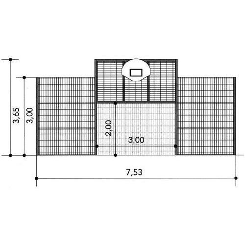 Un fronton : poteaux supports Ø 102 mm et panneaux «type caillebotis», mailles 42 x 98 mm. L'ensemble est en acier galvanisé thermolaqué. Largeur totale du fronton : 7,84 m. Un but en tube acier galvanisé thermolaqué Ø 102 mm pour les parties avant et arrière, dimensions intérieures du but : 3 m x 2 m, Un fond de but et deux côtés des buts en panneaux «type caillebotis» en acier galvanisé thermolaqué. Un panneau de basket forme demi-lune, dimensions 120 cm x 90 cm en PEHD renforcé, monté sur une structure très robuste, déport du panneau de basket par rapport au but : 60 cm, cercle très renforcé «antivandalisme» sans filet Montage en scellement direct. Modèle sur platine, nous consulter. But certifié conforme au code du sport. Une notice de montage détaillée (comprenant également les cotes nécessaires à la mise en uvre des massifs en béton) est fournie avec le matériel. Finition : Galvanisée