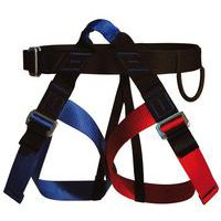 Harnais d'escalade entièrement réglable, cuisse droite bleue, cuisse gauche rouge pour des repères visuels.