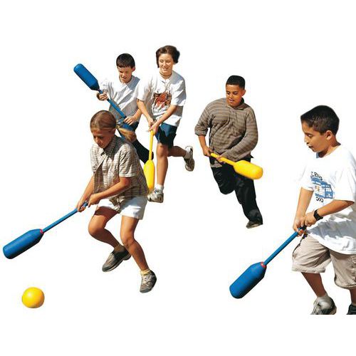 Kit composé de 12 sticks avec une tête droite recouverte de mousse (6 bleus et 6 jaunes) et de 2 balles.
