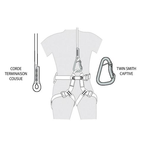 Le kit est composé d'un mousqueton de sécurité captif TWIN SMITH CAPTIVE fixé à une extrémité de la corde WALL SCHOOL 10.2 munie d'une terminaison cousue.