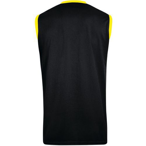 Débardeur de basket sans manche et col rond. Intérieur en couleur contrastante. Maillot réversible, de couleur noir/jaune. 100 % polyester. Disponible en différentes tailles.