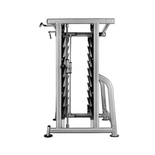 - Vous pouvez aussi travailler avec une barre libre sans guide. De l'autre côté du rack, il y a 9 niveaux de repose barre pour travailler librement avec une barre de longueur 220 cm.