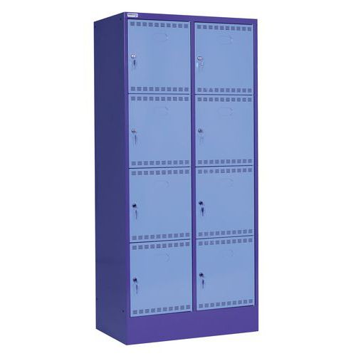 Socle hauteur 15 cm protégeant de la poussière.Armoire à casiers avec système de branchement électrique.