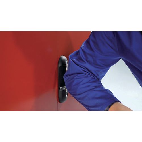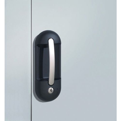 Armoire à portes battantes en acier. Suspension de porte sur des charnières extérieures, avec un angle d'ouverture d'environ 180°. Renforcement de la porte pour une stabilité accrue et barre de fermeture masquée. Différentes variantes de dimensions (3 longueurs, 1 hauteur). Haute flexibilité de l´aménagement intérieur grâce à un ajustement possible tous les 15 mm. Une sécurité d´utilisation, une résistance à l´usure et un aspect encore améliorés grâce à la serrure à poignée moulée Ergo-Lock (fermeture à 3 points, serrure à cylindre, livrée avec 2 clés). Capacité de charge par tablette zinguée : 110 kg. Capacité de charge totale de l'armoire : 700 kg. Coloris structure : gris RAL 7035. Coloris portes au choix : bleu RAL 5010, vert RAL 6011 ou gris RAL 7035.