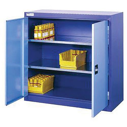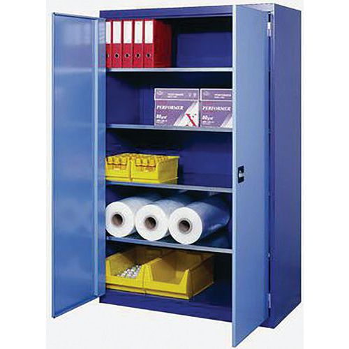 Armoire monobloc à portes battantes. Portes battantes avec oméga de renfort et angle d'ouverture environ 115°. Fermeture par serrure cylindrique, système Key Lock. Tablettes réglables en hauteur par pas de 25 mm. Acier épaisseur 10/10ème.