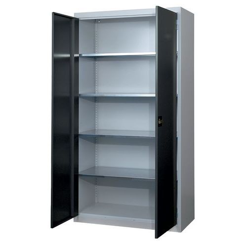 En tôle d‘acier de qualité supérieure.Armoire à portes battantes avec serrure de sécurité à poignée tournante .