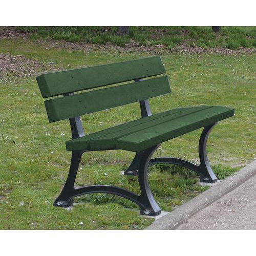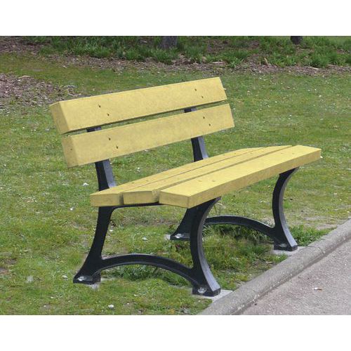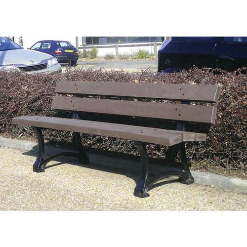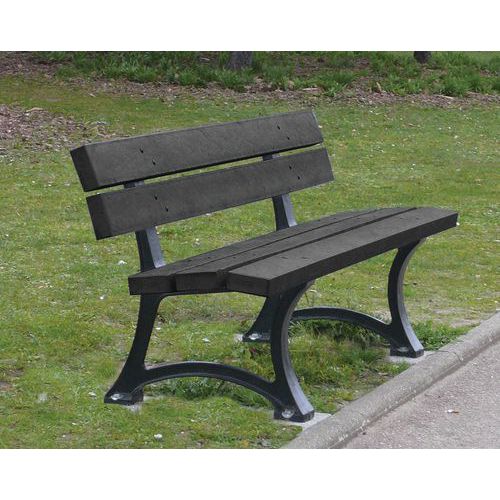 Plastique et fonte. Assise renforcée composée de lattes section 5 x 12 cm, angles chanfreinés. Pieds laqués noir. A fixer sur sol dur par scellement (4 goujons 12 x 120 mm fournis) sauf sur l’enrobé fixation chimique. Livré monté ou en Kit. Coloris noir disponible sur demande en version montée ou démontée. Coloris sable également disponible sur demande en version démontée.