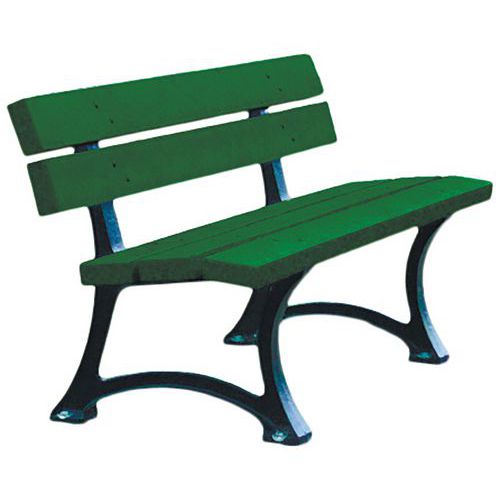 Plastique et fonte. Assise renforcée composée de lattes section 5 x 12 cm, angles chanfreinés. Pieds laqués noir. A fixer sur sol dur par scellement (4 goujons 12 x 120 mm fournis) sauf sur l’enrobé fixation chimique. Livré monté ou en Kit. Coloris noir disponible sur demande en version montée ou démontée. Coloris sable également disponible sur demande en version démontée.