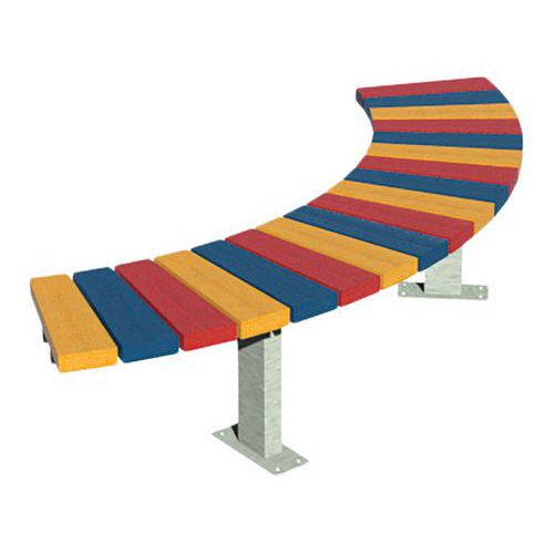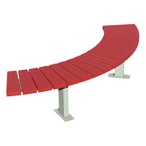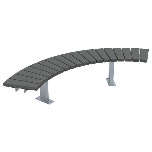 Assise en plastique recyclé Banquette sans entretien Imputrescible Résiste à l'eau et à l'humidité Anti UV et anti tags Banquette Contour 1/4 de rond avec lattes : section 4 x 12 cm. Ossature et piètement en acier finition galvanisé. A fixer sur sol dur par 8 goujons d'ancrage non fournis pour un module. Coloris vert, noir, sable, disponibles sur demande