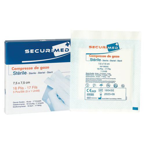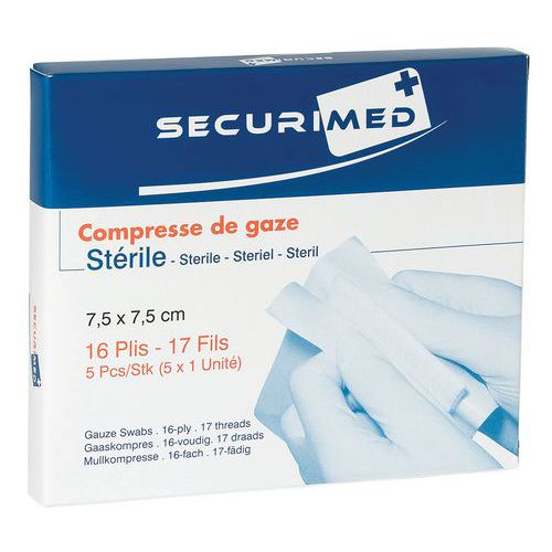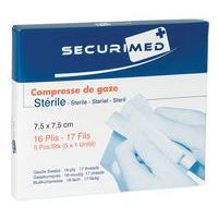 5 boîtes de 5 compresses de gaze stérile, 5x5cm-Securimed, Nb de pièces: 25, Longueurs: 7.5 cm