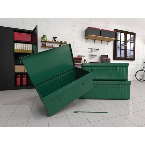 Cantines acier en tôle acier laminé à froid avec revêtement peinture cuite au four inoxydable. Couvercle à bord roulé sur fil acier. Côtés sertis et non soudés. Renfort périphérique. Nervures embouties prolongées sur le fond de la malle. 2 poignées rabattables en fil d'acier. Livrées avec tringle (Ø 6 mm percée à l'extrémité). Coloris vert foncé.