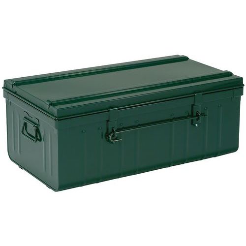 Cantines acier en tôle acier laminé à froid avec revêtement peinture cuite au four inoxydable. Couvercle à bord roulé sur fil acier. Côtés sertis et non soudés. Renfort périphérique. Nervures embouties prolongées sur le fond de la malle. 2 poignées rabattables en fil d'acier. Livrées avec tringle (Ø 6 mm percée à l'extrémité). Coloris vert foncé.