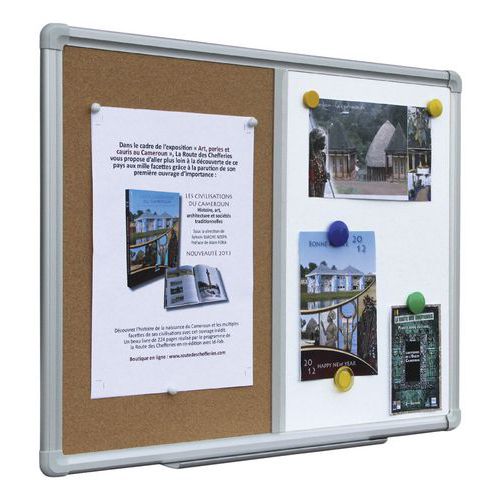 4 modèles disponibles : laqué, émaillé, mixte et liège Cadre aluminium anodisé épaisseur 15 mm avec coins PVC arrondis Panneau mixte moitié tôle laquée moitié liège Livrés sans visserie.
