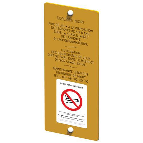Les textes sont en impression numérique et sont à transmettre lors de votre commande (école, espaces publics, nom du service de maintenance et ses coordonnées téléphoniques).
