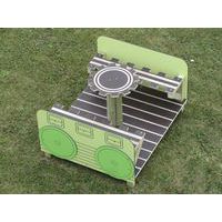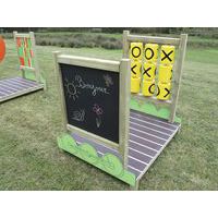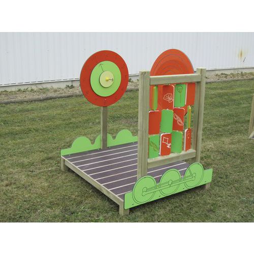 Composé de : Locomotive, wagon table et bancs, wagon panneau ludique, wagon panneau d’éveil et wagon toboggan