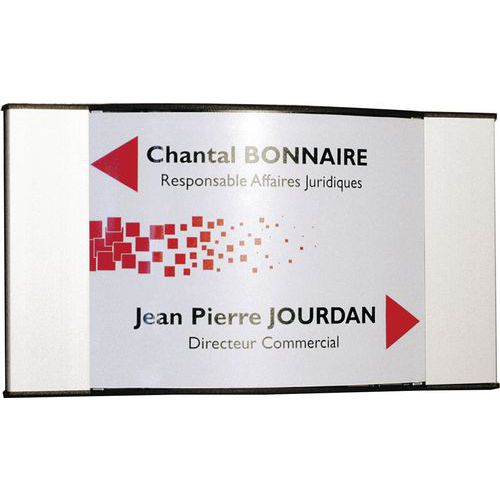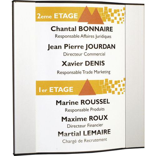 - Façade transparente en PVC semi-rigide anti-reflet pour glisser les documents à présenter.