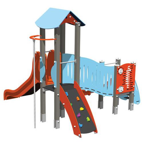 - Composée de : 2 toboggans + 1 escalier + 1 mur oblique + 1 panneau ludique.