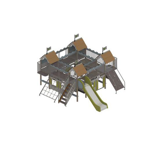 - Composée de quatre tours avec toit, un escalier, un toboggan, un mur à grimper, quatre