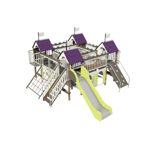 - Composée de quatre tours avec toit, un escalier, un toboggan, un mur à grimper, quatre