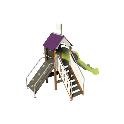 - Composée d’une tour avec toit, un escalier, un mur à grimper, des bancs sous plancher et un toboggan.
