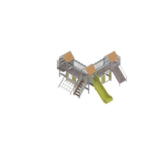 - Composée de trois tours avec toit, un escalier, un toboggan, un mur à grimper, deux