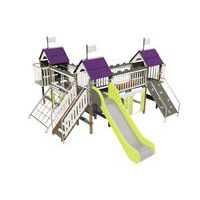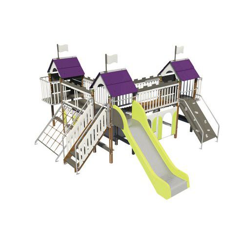 - Composée de trois tours avec toit, un escalier, un toboggan, un mur à grimper, deux