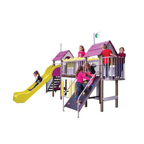 - Composée de deux tours avec toit, un escalier, un toboggan, un mur à grimper, une maisonnette, un passage cintré, un balcon, des bancs sous plancher