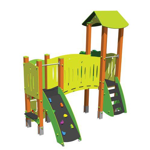 Composé de 2 tourelles dont 1 avec toit, planchers à 0,90 m, 1 toboggan, 1 escalier, 1 passerelle cintrée, 1 mur oblique, 1 marchande sous tourelle et 1 panneau ludique.